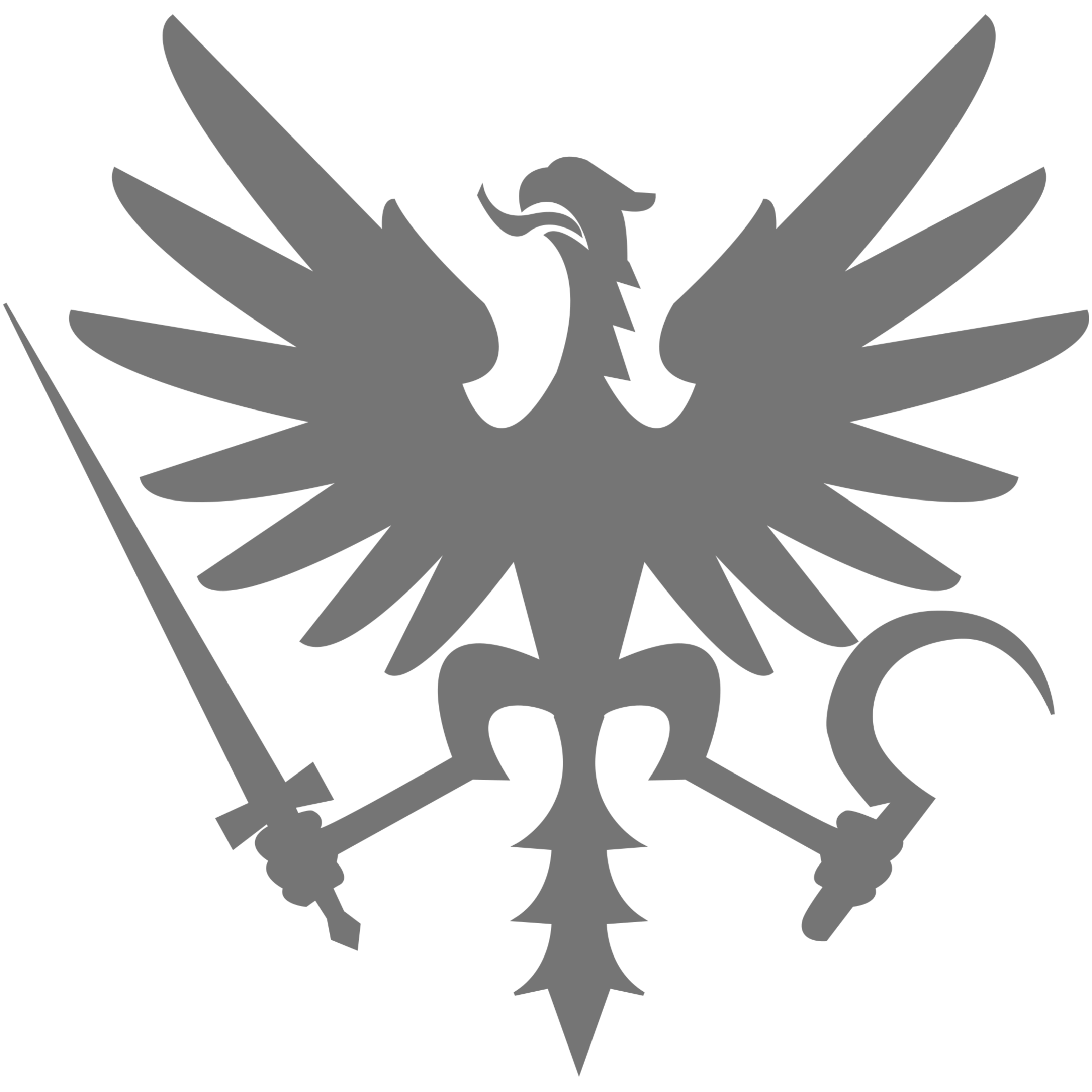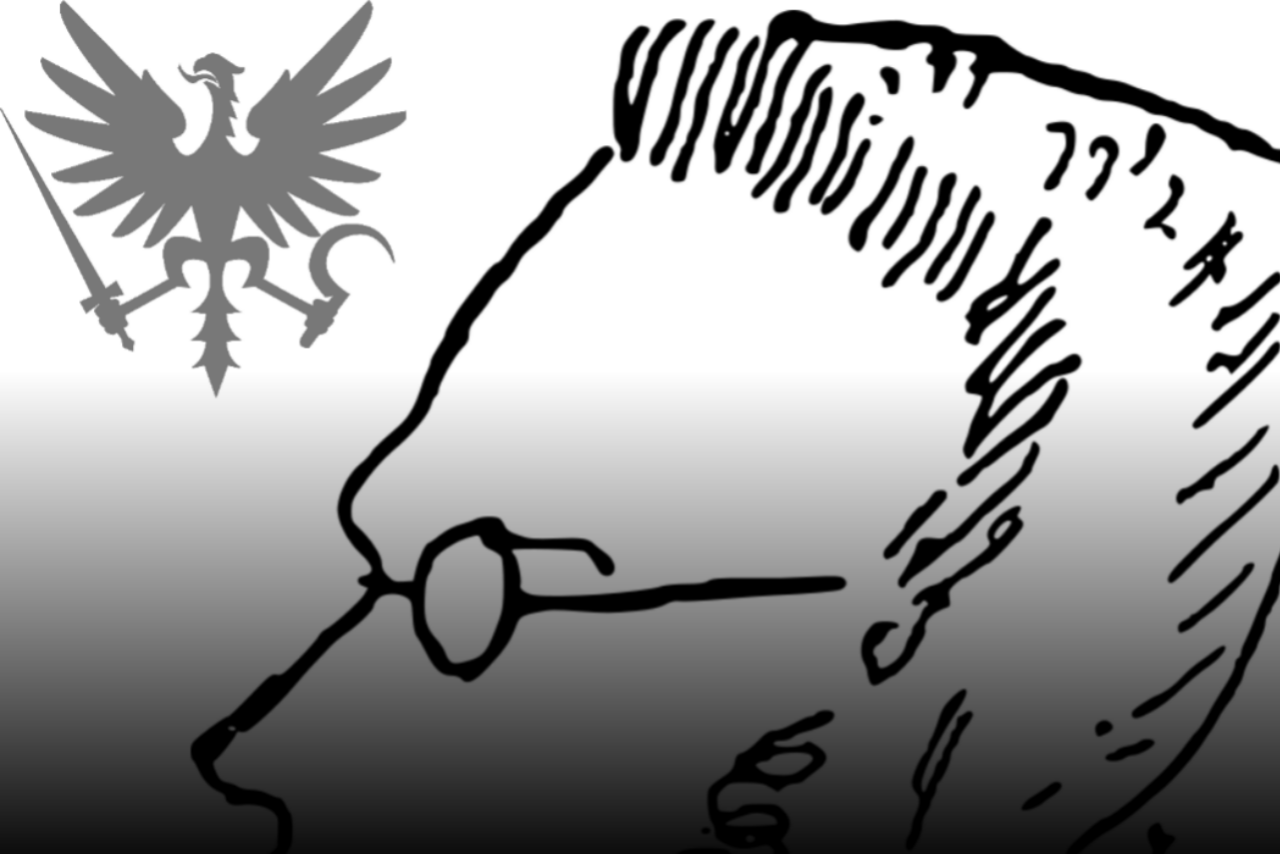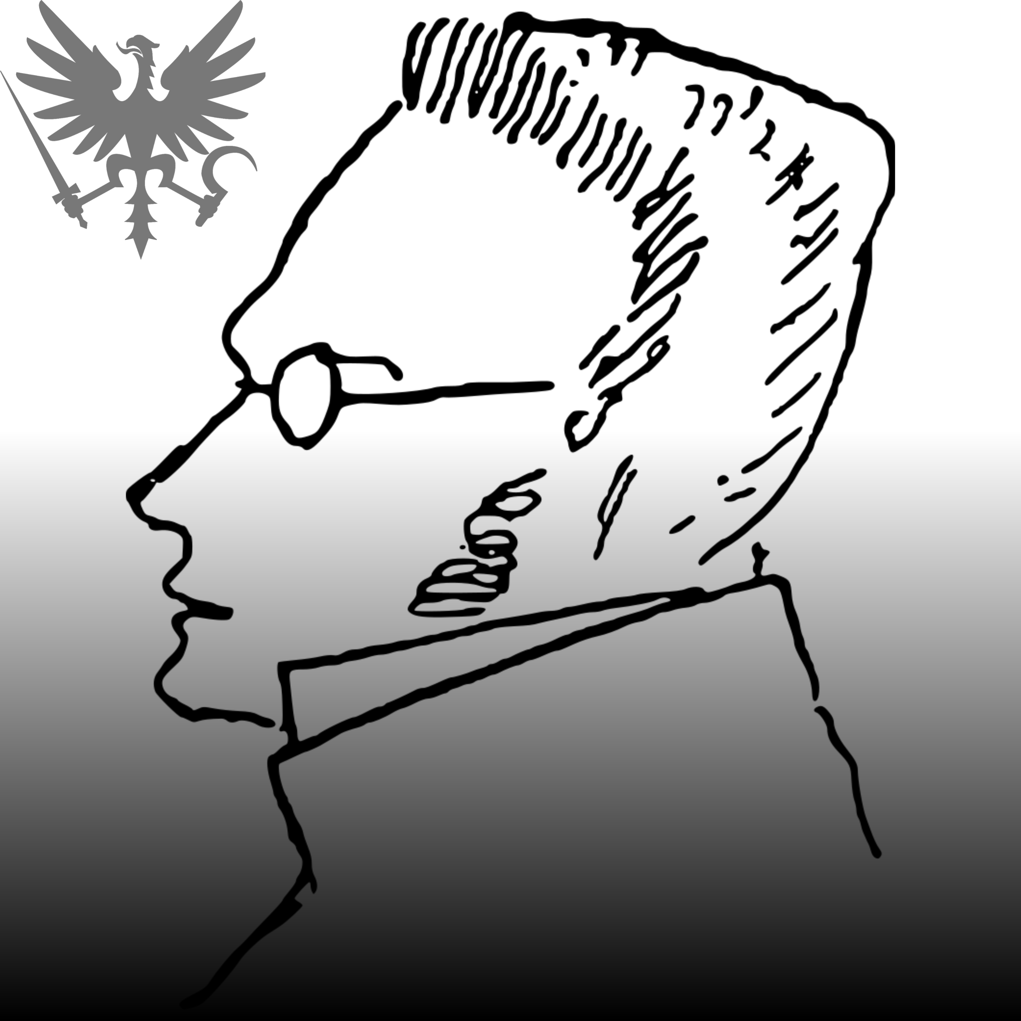 Ícone do site do Schedios. Ao centro, caricatura do filósofo alemão Max Stirner, por Friedrich Engels; no canto superior esquerdo, Águia do Schedios (cf. detalhes dela na Galeria).