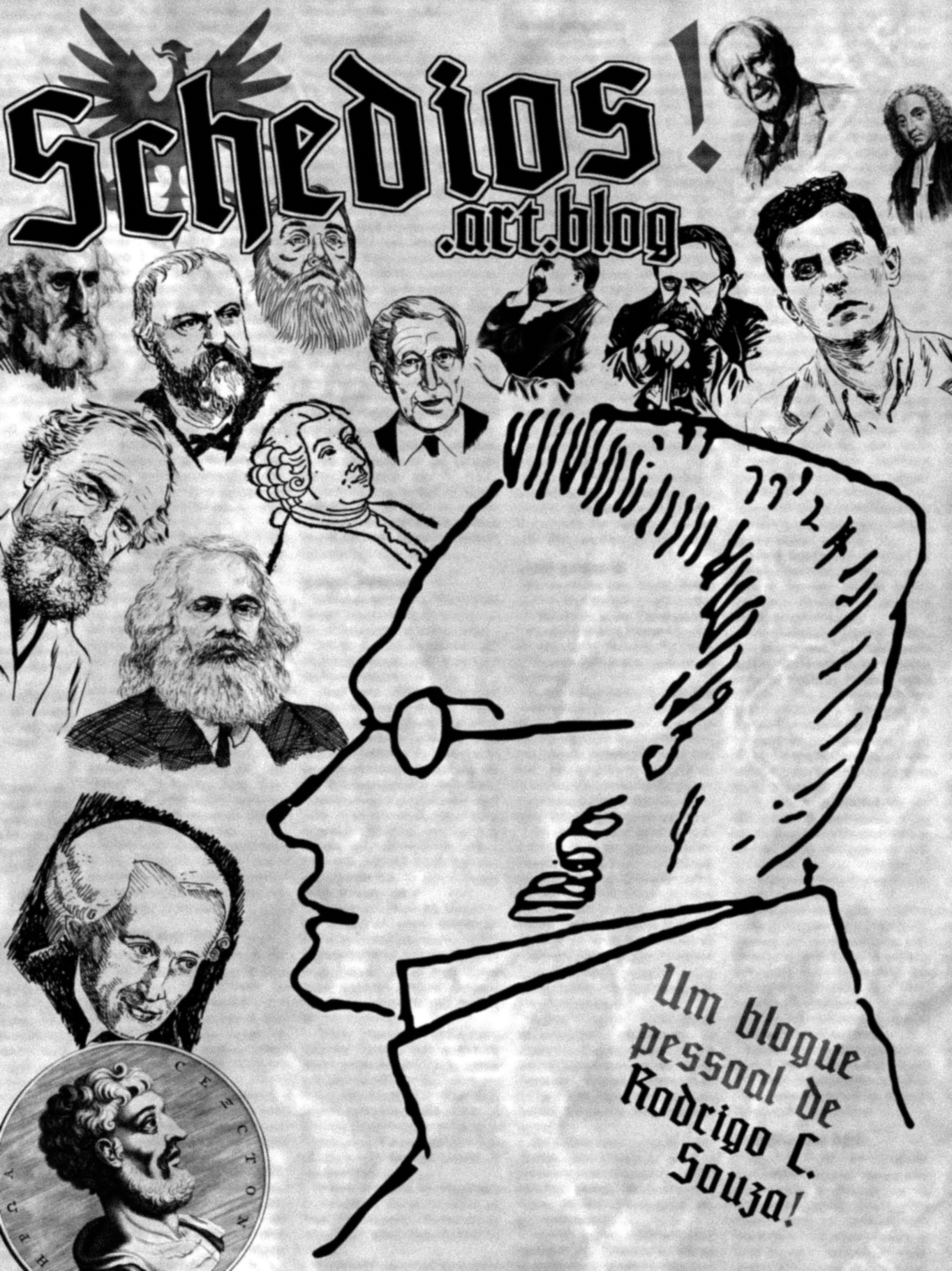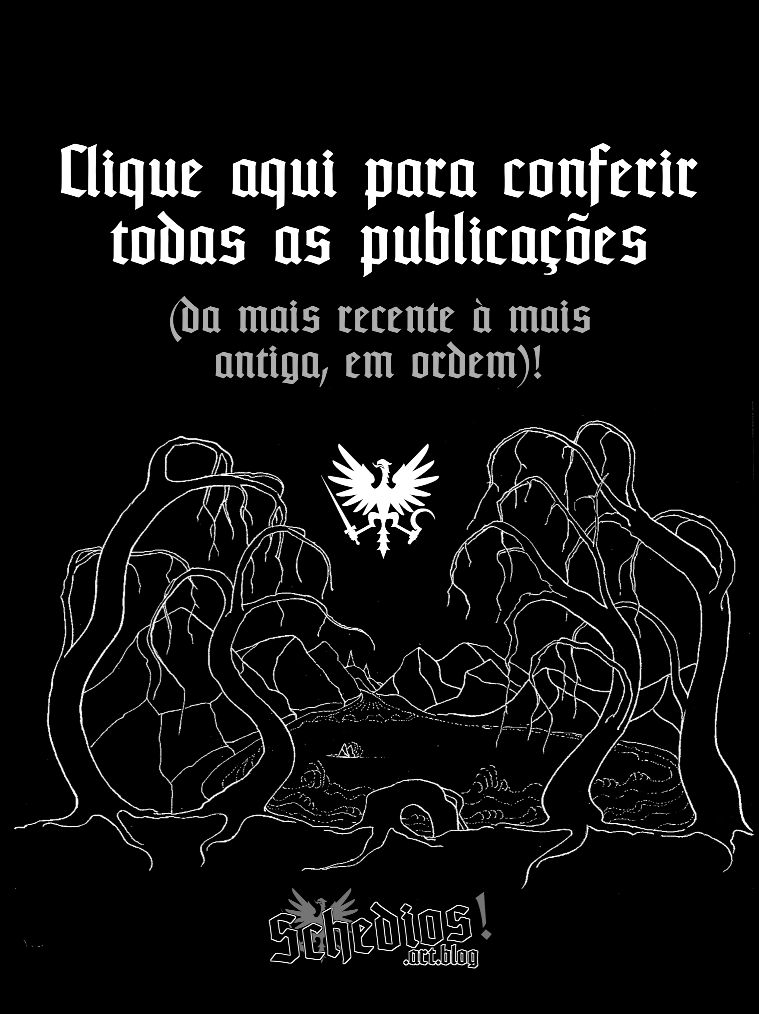 Logotipo do Schedios (cor branca). Há nele a Águia do Schedios (cf. detalhes dela aqui na Galeria).Logotipo do Schedios (cor preta). Há nele a Águia do Schedios (cf. detalhes dela aqui na Galeria).Águia do Schedios (cor cinza). Desenho de origem incerta (com breves modificações). Águia usada, entre outros casos, pelo Cercle Proudhon e pelo nacional-bolchevismo russo de Eduard Limonov.Águia do Schedios (cor preta). Desenho de origem incerta (com breves modificações). Desenho de origem incerta (com breves modificações). Águia usada, entre outros casos, pelo Cercle Proudhon e pelo nacional-bolchevismo russo de Eduard Limonov.Ícone do site do Schedios. Ao centro, caricatura do filósofo alemão Max Stirner, por Friedrich Engels; no canto superior esquerdo, Águia do Schedios (cf. detalhes dela aqui na Galeria).Miniatura de testes de publicações do site Schedios, contendo o ícone do site Schedios (cf. detalhes aqui na Galeria).Cartaz Schedios #1. No canto superior esquerdo, logotipo do Schedios (cor preta). Por toda a imagem, desenhos de (sem ordem): Max Stirner, Sexto Empírico, Karl Marx, William James, J. R. R. Tolkien, Frithjof Schuon, Ernst Jünger, Immanuel Kant, David Hume, Georges Sorel, Aleksandr Dugin, Friedrich Nietzsche, Pierre-Joseph Proudhon, Ludwig Wittgenstein e George Berkeley.Cartaz Schedios #2. Na parte superior, ícone do Schedios (cor branca). Ao centro da imagem, com apoio na parte inferior do cartaz, foto do organista e compositor francês Louis Vierne em um de seus últimos anos de vida. Ao redor da imagem de Vierne, logotipos dos seguintes projetos musicais (sem ordem): Black Sabbath, Siouxsie and the Banshees, Slayer, Trobar de Morte, Symarip, Mc Igu, The Klansmen, Cartola, Arditi, Nokturnal Mortum, Entombed, Sex Pistols, Skrewdriver, Negative XP, Burzum, João Gilberto, Candlemass, Billie Eilish, Grunt, Racionais MC’s, Skarface, Draconian, Death in June, The Last Resort, Misfits, The Velvet Underground, Bathory, Nightwish e Johnny Cash.Cartaz de direcionamento ao blogue. Na parte inferior, logotipo do Schedios na cor preta (cf. detalhes aqui na Galeria); ao centro, “Wudu wyrtum faest” (1928), desenho por J. R. R. Tolkien (cores invertidas). Ao centro e dentro do desenho de Tolkien, a Águia do Schedios (cf. detalhes dela aqui na Galeria).Assinatura do único membro do Schedios, Rodrigo C. Souza (escrito “Rodrigo Costa Souza”).Imagem da página inicial. Esboço de “The Misty Mountains looking West from the Eyrie towards Goblin Gate” (1937), por J. R. R. Tolkien (cores invertidas).Rodrigo C. Souza